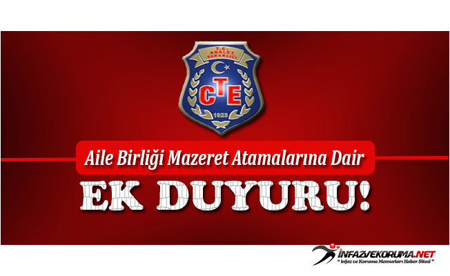 Ceza Tevkifevleri Genel Müdürlüğü tarafından 07/08/2018 günü Aile birliği mazeret atamalarına ilişkin ek duyuru yayınlamıştır. Duyuru aşağıdaki şekliyle takipçilerimizin bilgisine sunulur.