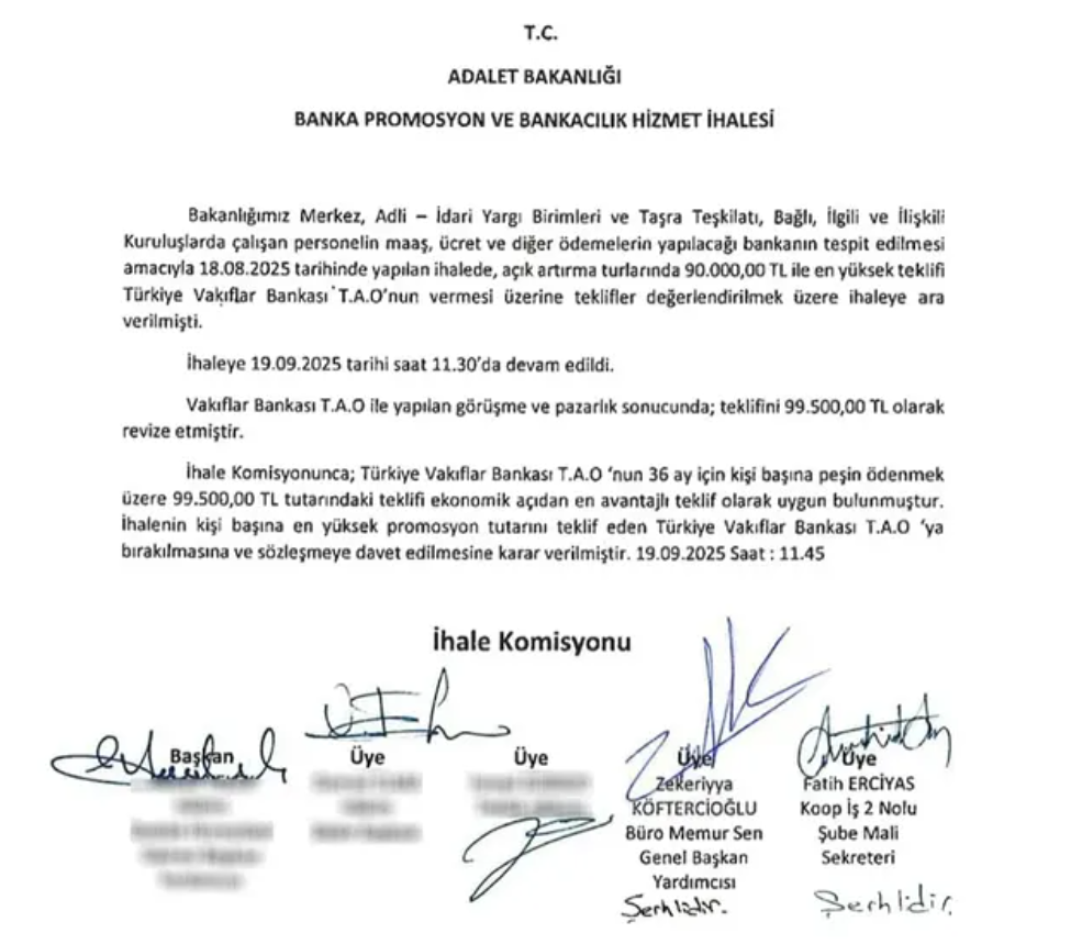 Bilindiği üzere; Adalet Bakanlığı Merkez, Adli — Idari Yargı Birimleri ve Taşra Teşkıtalı, Bağlı, Ilgili ve llişkili Kuruluşlarda çalışan personelin maaş, ücret ve diğer ödemelerinin yapılacağı bankanın tespit edlmesi amacıyla 18.08.2025 tarihinde ihale yapılmıştı. Açık artırma turlarında 90.000,00 TL ile en yüksek teklifi Turkiye Vakıflar Bankası •T.A.O'nun vermesi üzerine teklifier değerlendirilmek uzere ihaleye ara verilmişti. Bunun akabinde 19/09/2025 tarihi itibariyle ihaleye devam edildiği ve sonucunda ihalenin Vakıfbank'a verildiği ne yer verilen karar metninde aşağıdaki ifadelere yer verilmiştir.