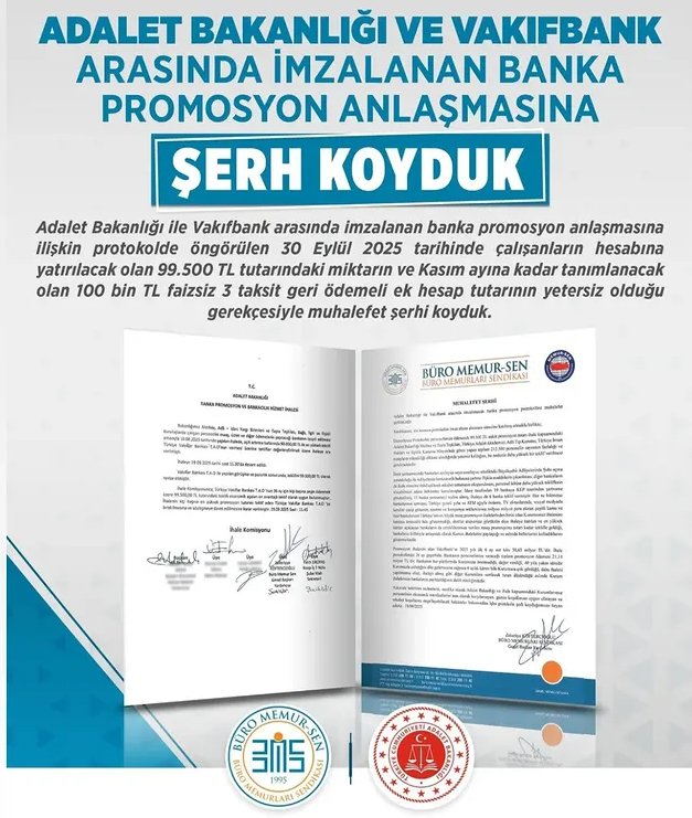 Adalet Bakanlığımız temsilcileri ve Büro Memur-Sen ile Koop-İş Sendikası yetkililerinin katılımıyla Vakıfbank’la yapılan görüşme sonucunda, banka her bir personelimize peşin ödenmek üzere 99.500 TL promosyon bedeli olarak teklifini revize etmiştir.
