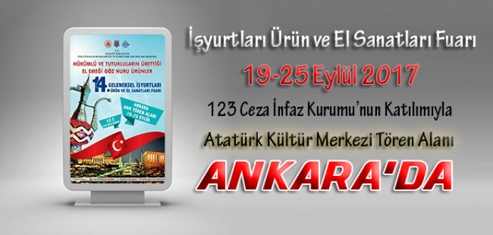 Adalet Bakanlığı Ceza İnfaz Kurumları ile Tutukevleri İşyurtları Kurumu tarafından bu yıl 14'üncüsü düzenlenecek olan “İşyurtları Kurumu Ürün ve El Sanatları Ankara Fuarı”nın açılışı 19 Eylül 2017 tarihinde saat 10'da Atatürk Kültür Merkezi Tören Alanında yapılacaktır. Fuar 19-25 Eylül 2017 tarihleri arasında açık kalacak ve saat 10.00-19.00 arası ziyaret edilebilecektir.