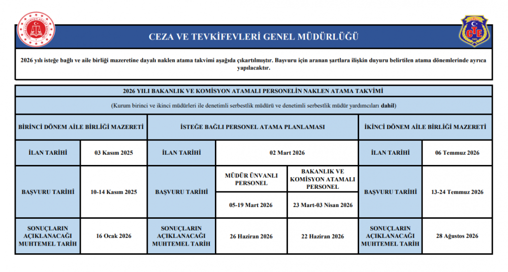 Bu itibarla, kurum birinci ve ikinci müdürleri ile denetimli serbestlik müdürü ve denetimli serbestlik müdür yardımcılarının 05-19 Mart 2026 tarihleri arasında, kurum birinci ve ikinci müdürleri ile denetimli serbestlik müdürü ve denetimli serbestlik müdür yardımcıları hariç diğer bakanlık atamalı personel ile komisyon atamalı personelin 23 Mart-03 Nisan 2026 tarihleri arasında taleplerini Norm ve Atama Sistemi (NAS) üzerinden göndermeleri gerekmektedir. Sistem üzerinden gönderilmeyen hiçbir talep dikkate alınmayacaktır.